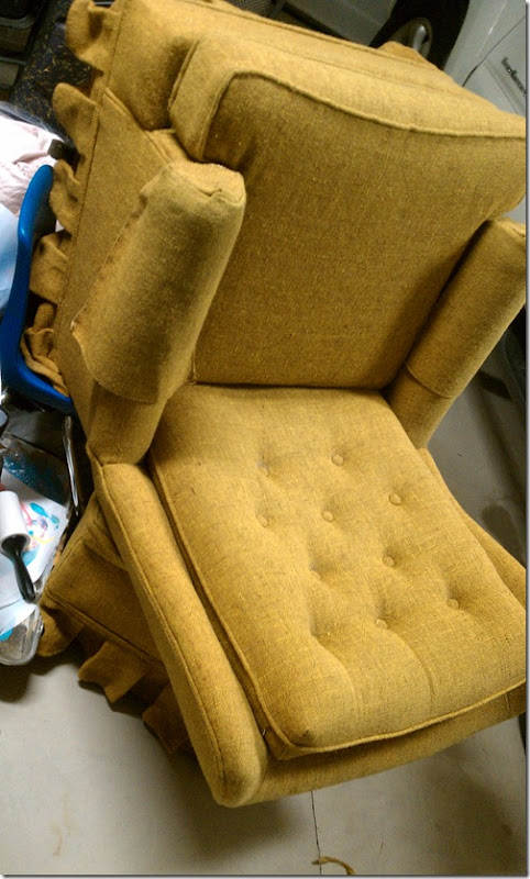 I went into the warehouse and zoomed in straight to this rocker/swivel chair and ottoman. I had to literally climb over things to get to them. I saw $40 (for both pieces) and although I hadn’t tested the durability of the frame decided that it was too great a deal to pass up. A gentleman who worked there pried both pieces from the corner that they were hiding in(just waiting on me), and I daintily sat on the edge of the chair and performed a rocking motion which was my feeble attempt at testing the durability of the chair. You see, I was wearing short capris and didn’t want my skin touching the fabric . I’m sure you would do the same thing so stop laughing! Since then, I’ve placed a small sheet in my vehicle for moments like these….